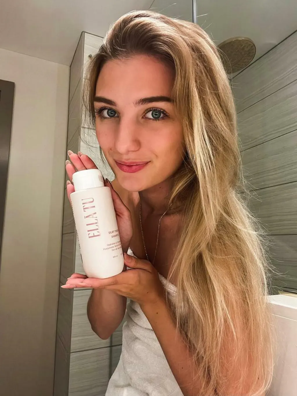 - Apply a dime-sized amount of Ellātu Silky Touch Shampoo to the roots of your hair.